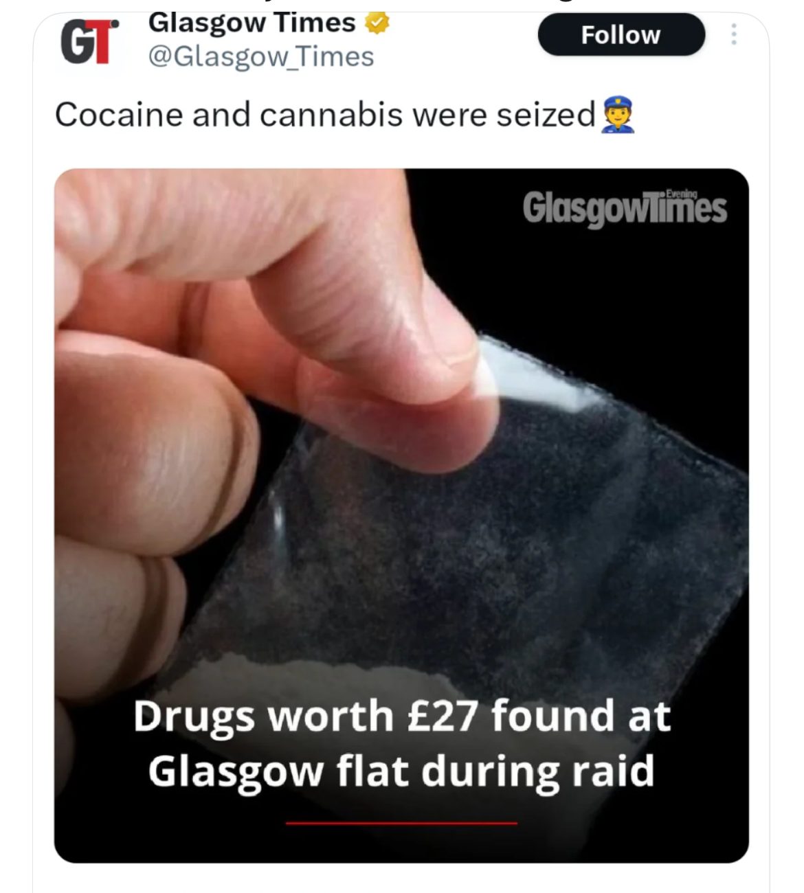 Headline of the week: Drugs worth £27 found at Glasgow flat during raid (later corrected to £27k)