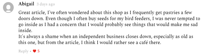 There have been some great comments praising Debora Bottino’s article on the pet shop. Here’s our pick: