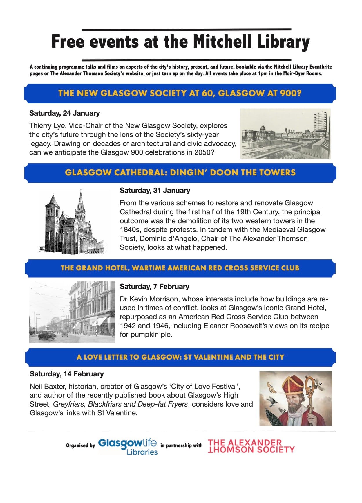 Behold the vast array of free events the AGT society is organising at one of Glasgow’s most beloved buildings from January 24. It kicks off with Thierry Lye of the New Glasgow Society, who asks: ‘can we anticipate the Glasgow 900 celebrations in 2050?’