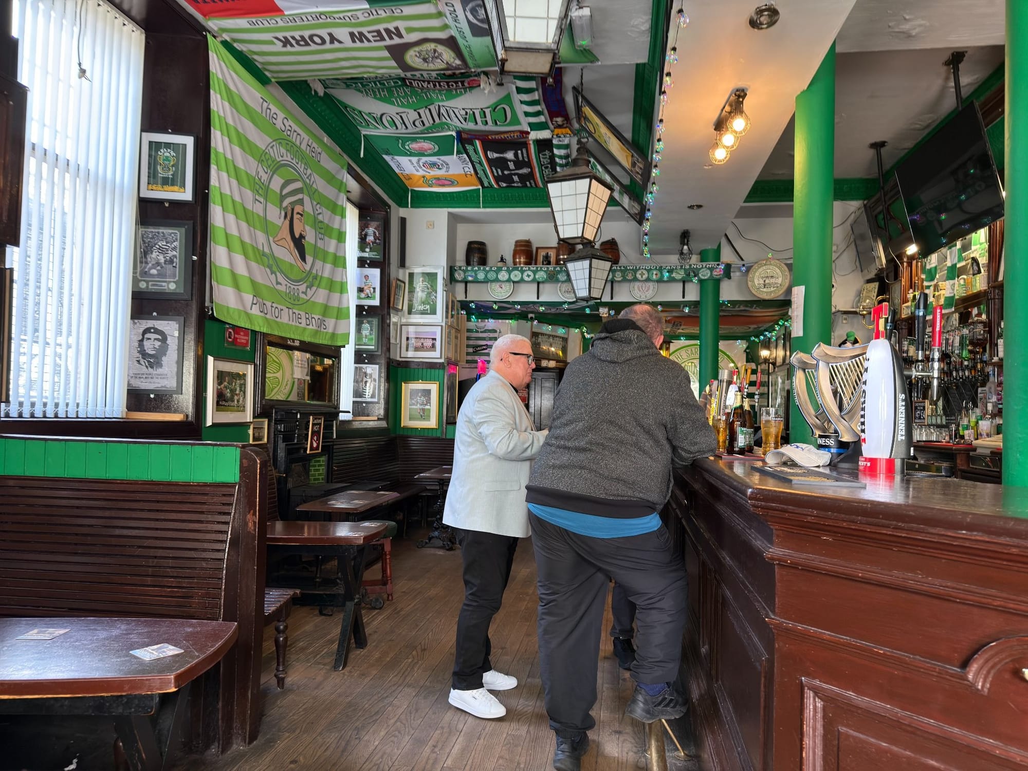 Finally, I make my way back to the Saracen Head. If you’re familiar with it, you’ll know it’s one of the many staunch Celtic pubs around the Gallowgate. One of the banners above the bar reads “CREATED BY IMMIGRANTS”, a reminder of what’s come before for this area. As historian Dr Martin Mitchell has written about, in 1847 alone, more than 50,000 Irish immigrants arrived in the city (and as we know, many of them settled around the Gallowgate). In the same year, the Glasgow Herald published a piece headlined “The Irish Invasion”, in which they described “the streets…literally swarming with vagrants”. By 1851, the Irish made up over 18 percent of the population of Glasgow.