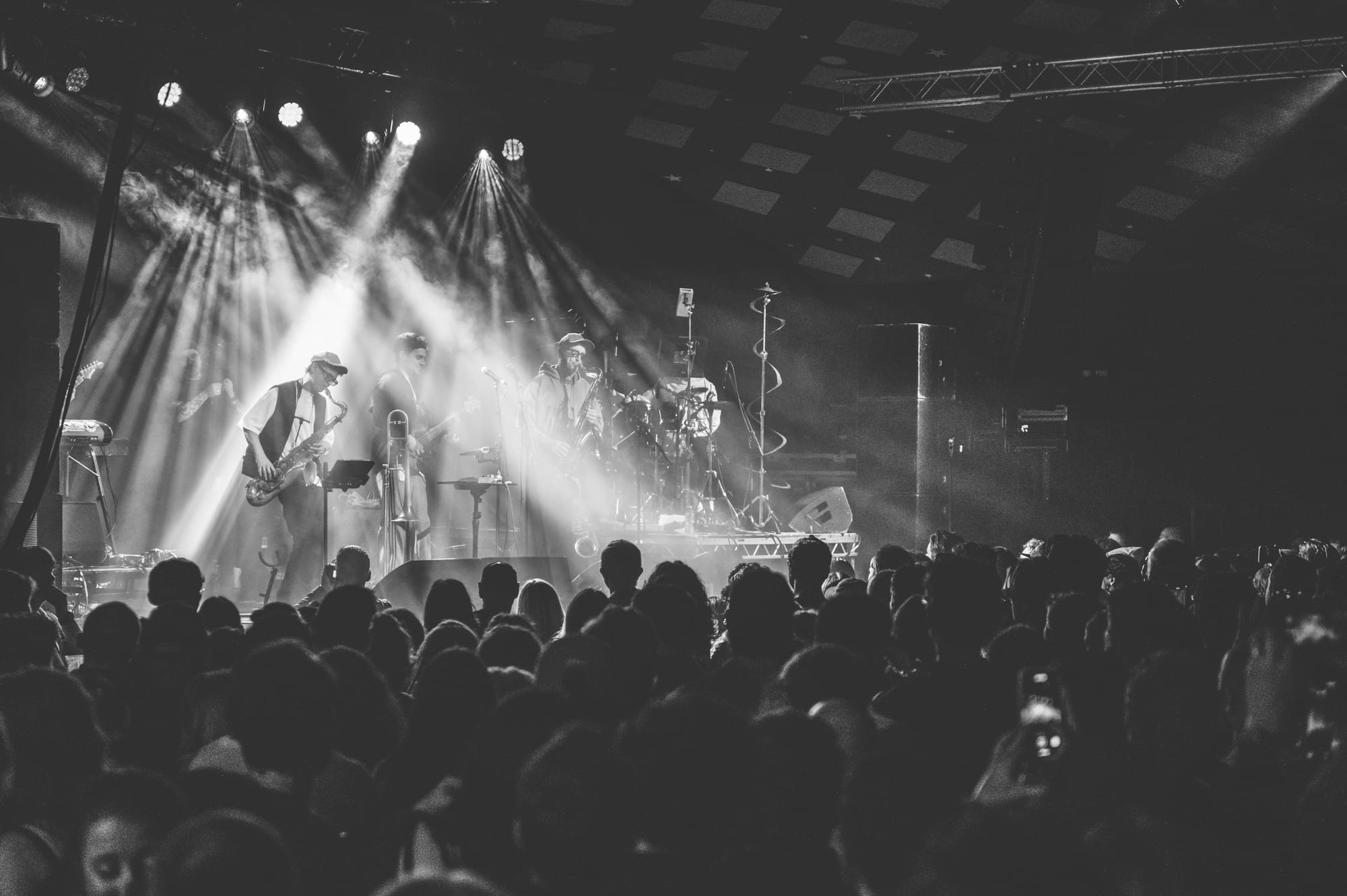 It’s just before 10pm and the Barrowlands is packed, stage lights turning the ceiling’s stars blue and red. Rising synth chords ring out, growing louder before halting abruptly. The room falls silent. Then, a splash of cymbals crashes before the brass section blasts. Thunderous bass and drums call the crowd to attention. Another brief pause and the audience’s roars fill the space, before the sequence repeats. The trombone and saxophones grow louder, while the drum patterns become increasingly intricate. Cheers and whoops grow deafening.