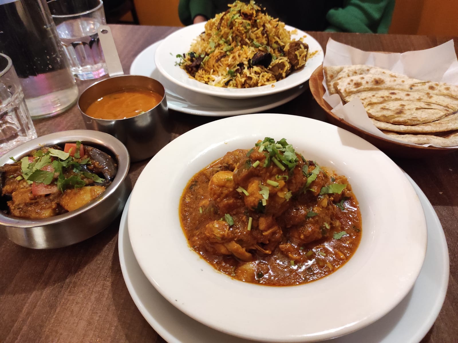 My co-diner and I opted for the lamb Hyderabadi biryani (what appeared to me to be a standard biryani but served with a very tomatoey gravy on the side), Kukad Raseeli (desi-style chicken on the bone), and a smoked aubergine and potato dish. We got some poppadoms with a very refreshing house chutney while waiting for the mains, it was minty and a touch bitter — quite unique.