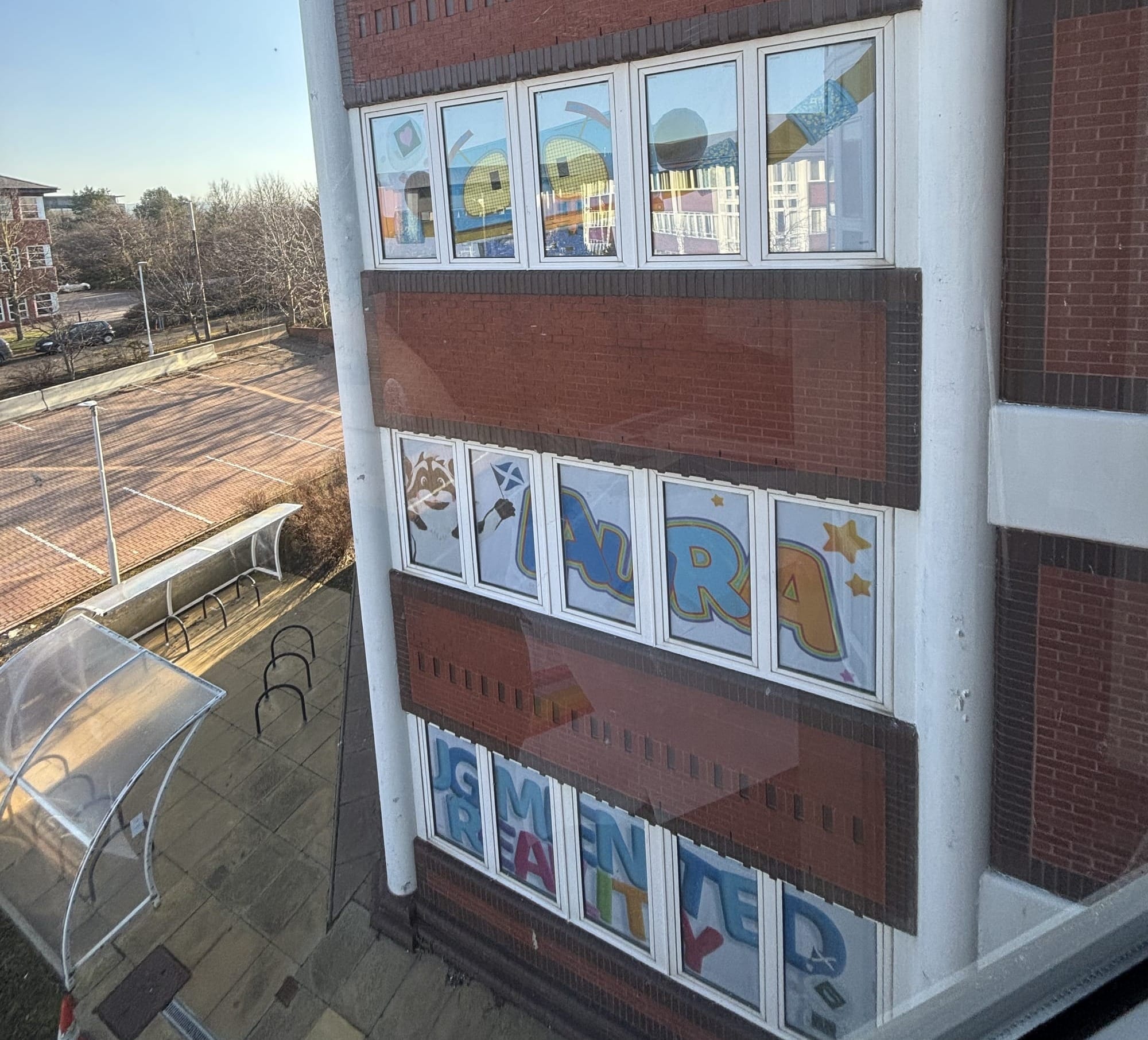 This is where the huge banners on Tay House come in, the ones that sparked queries from readers and my initial inquiries. I found that Hope had occupied at least six units in Tay House, the rust red office block that straddles the M8, between December 2024 and the end of January 2026. These included the entirety of floor six and much of the ground floor. K and others plastered these banners on the inside of every office unit Hope occupied in that building.