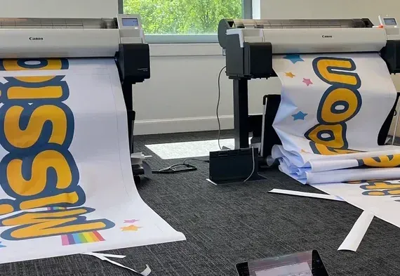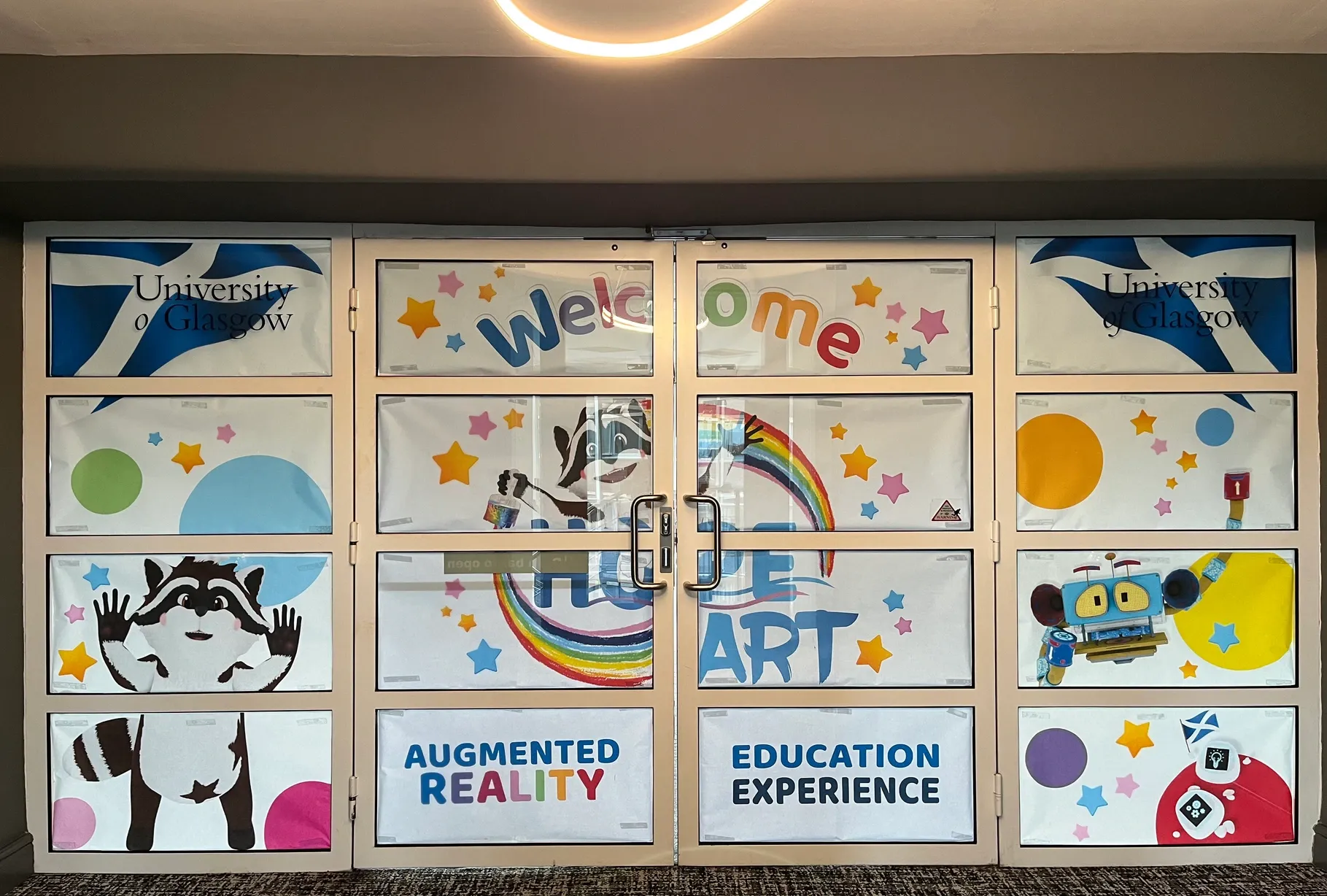 Designs included our friend Ziggy the talking raccoon, as well as Robert the robot, and, yes, those giant words reading “augmented reality education”. K tells me that the design process was meticulous, involving high-grade canvas sufficiently opaque in bright sunlight to prevent people “to be able to look inside”. To print off giant, A0-sized reams of this stuff, high-tech printers are required. One model I saw in Hope’s offices retails at £1,199, and Hope had several. Adler wasn’t mucking around with these banners.