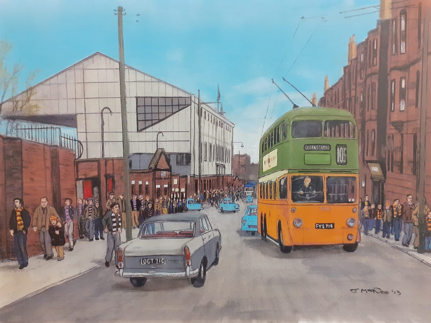 Pigeon football isn’t MacNee’s only pastime. He also plays the guitar and makes model kits. As well as this, he loves to paint, old Glasgow street scenes, mainly. He once did a project documenting the streets around Maryhill, with the final works displayed at the Burgh Halls. He pulls out his phone and shows me his impression of Firhill, the old green and orange Corporation trolleybus rolling by as Jags fans make their way home. The painting is hanging up in Firhill, he says excitedly.