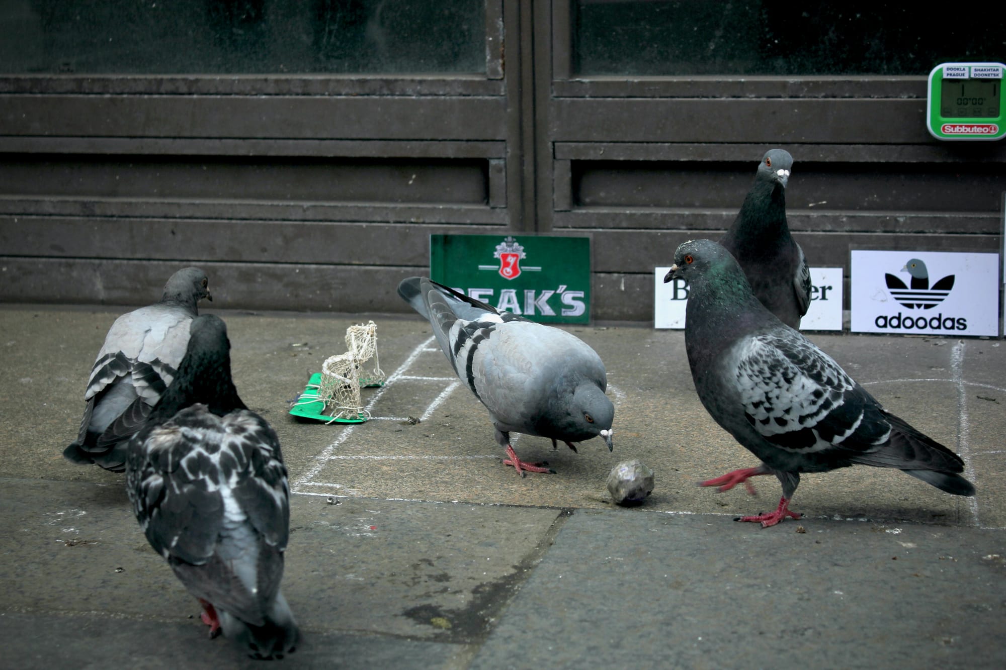 Today, it’s a streamlined operation. The miniature chalk pitch has been drawn neatly onto the pavement, with the tiny goal posts at each end. There is branded signage velcroed onto the wall above the pitch: ‘Just Doo It’; ‘Adoodas’; ‘Pidgy Power’; ‘Burderweiser’; ‘Beak’s’.