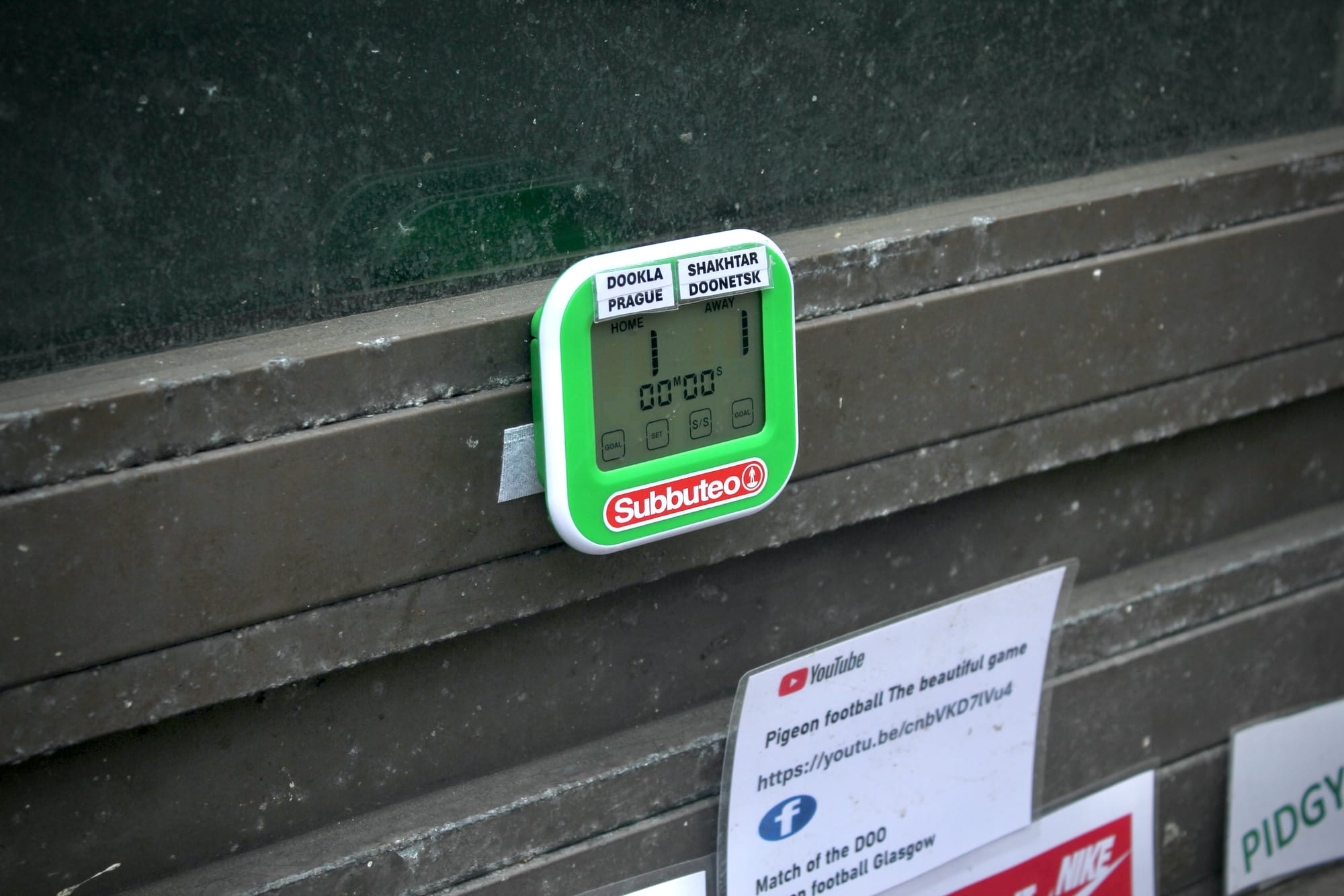It’s supposed to be a five aside, but there are at least a dozen doos knocking about the modified cat toy, which duly dispenses the birdseed as they tap and roll it with their beaks. MacNee points out Una, a player with only one leg, and begins to reel off other names, before realising one of the pigeons has put the ball in the back of the plastic net. He walks over and hits the scoreboard display, which emits tinny sound effects of crowds cheering.