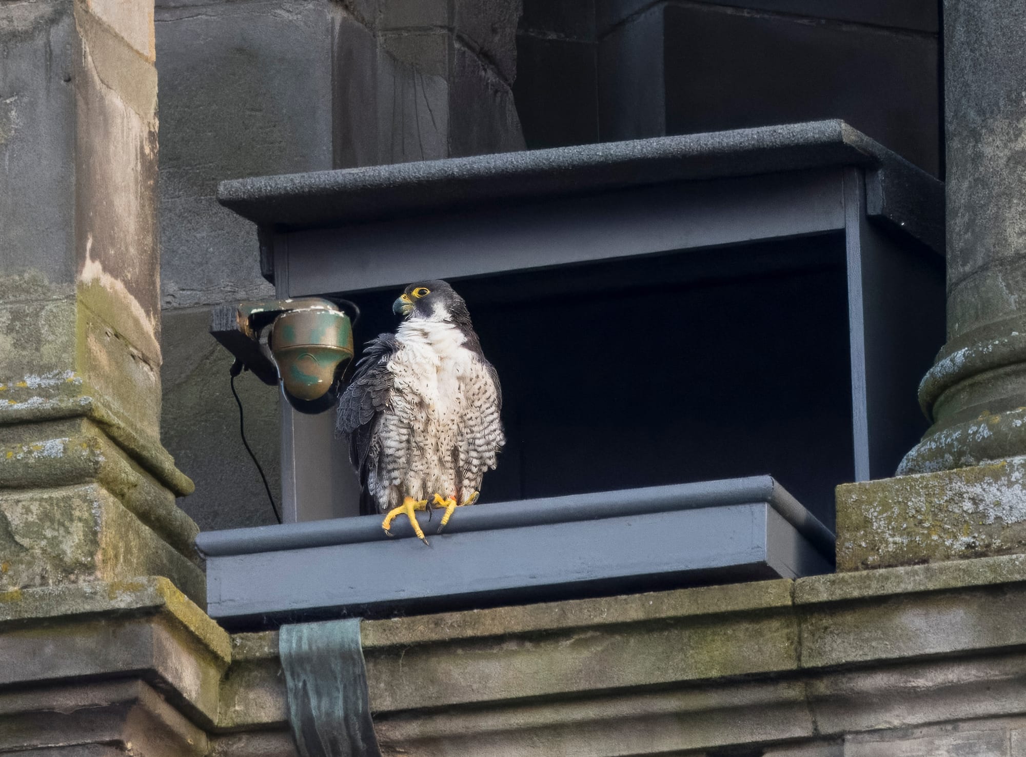A broody Bonnie, named as part of a Glasgow Uni publicity spree, has since laid an egg. In an excitable update from the council, we can see the pair protecting a wee brown egg in their nest box, installed by Glasgow’s premier peregrine documenter, Steven McGrath.