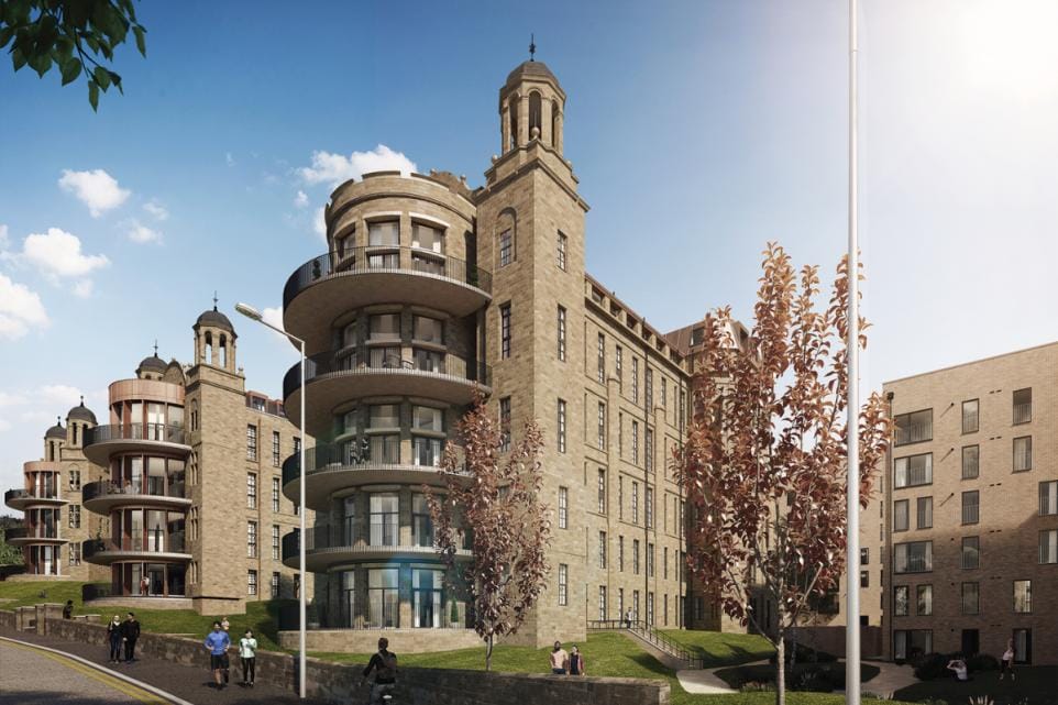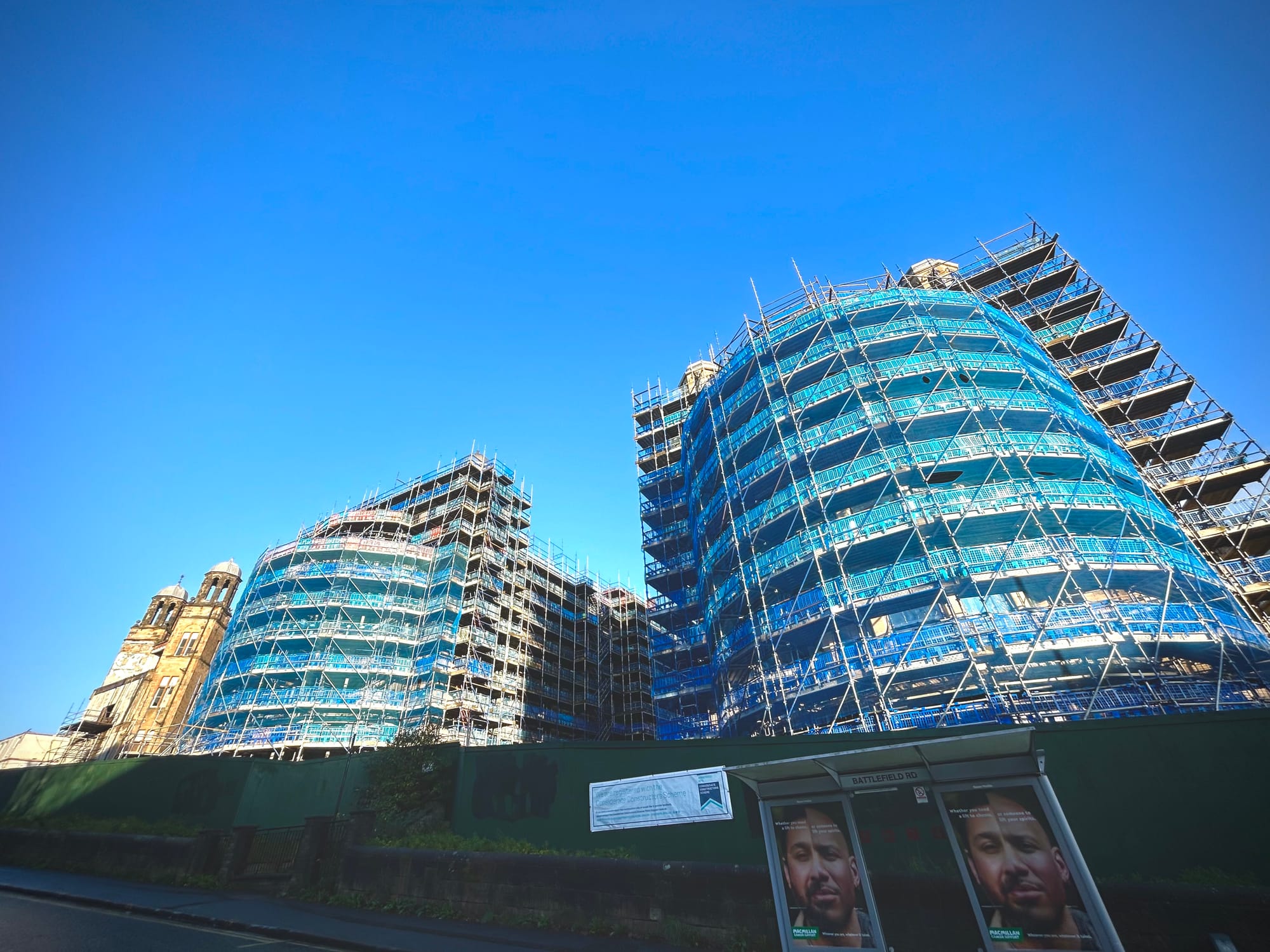 🏥 Contrary to various media reports about the former Victoria Infirmary Nightingale buildings being “completed”, “reborn”, “restored” and “set for launch”, we can confirm that the buildings in question remain shrouded in scaffolding and far from completion. As ever, don’t believe the hype where property companies and well-drafted press releases are concerned. What is true is that the £29.3m first phase of the development has been completed, five years after work first began. Work to redevelop the rest of the site is ongoing, including the restoration of the open-plan Nightingale wards, as confirmed by Urban Realm last month. Cycling past the completed parts of the development this morning — bathed in the early morning golden sun — the frontage of one building had been stripped of its balcony, and work looked scarcely to have started. Windows were broken and boarded up, and the visible parts of the interior were all but a shell. The new balconies on the other two buildings had been erected, and windows installed, but both were entirely wrapped in scaffolding and blue tarp. Reborn it is not.