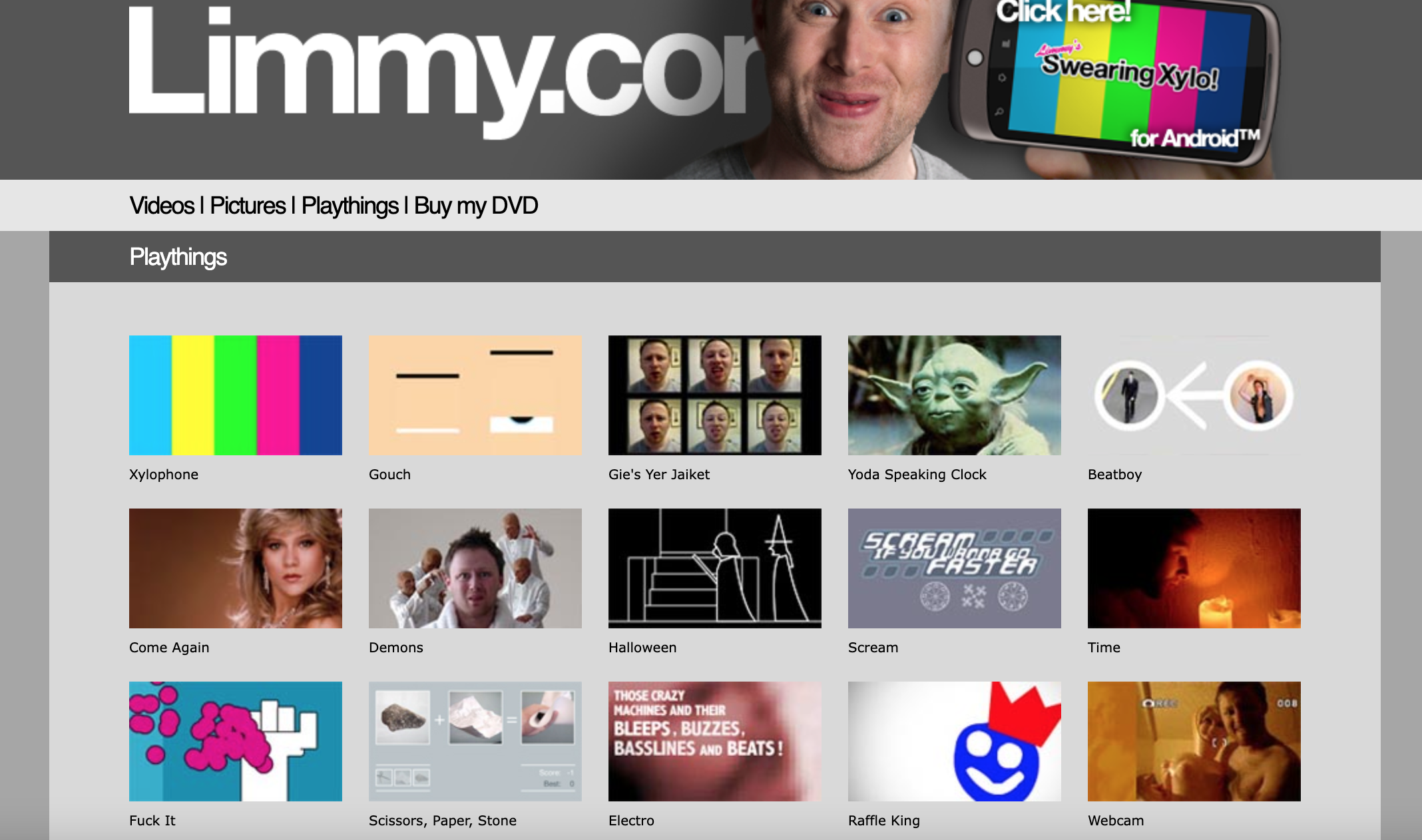 Limmy also made short Flash videos like Glaswegian Halloween, which is still on his YouTube. He told the Guardian in 2007 that he eventually used his Flash skills to build limmy.com, as somewhere to put his “wee animations, wee interactive toys” (like the swearing xylophone, which can thankfully still be viewed, and indeed played, online here). By 2002, he was uploading videos, skits and comedy shorts, and in 2006 he sold his stake in Chunk to co-founder Donnie Kerrigan to focus on his comedy career.