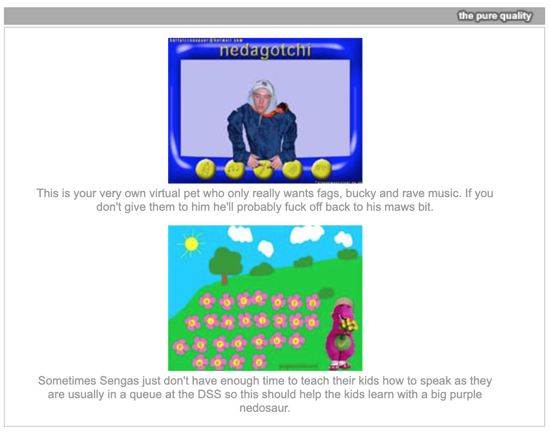 We contacted Limmy for this article, but he declined an interview and didn’t respond to our questions. We also got a bounceback from the original Glasgow Survival email address, and received no response from the email inbox of the creator of the Nedagotchi game, which appears to have been submitted to the site. Limmy’s own website, limmy.com, was recommended on Glasgow Survival as, “The original and best site for glasgow based playthings and basic limmyness”. It would therefore be a bold move if Limmy was indeed behind it — the Glasgow Survival email inbox regularly received threats of violence, which the site’s moderator would gleefully republish on ‘the pure news’ sidebar section.