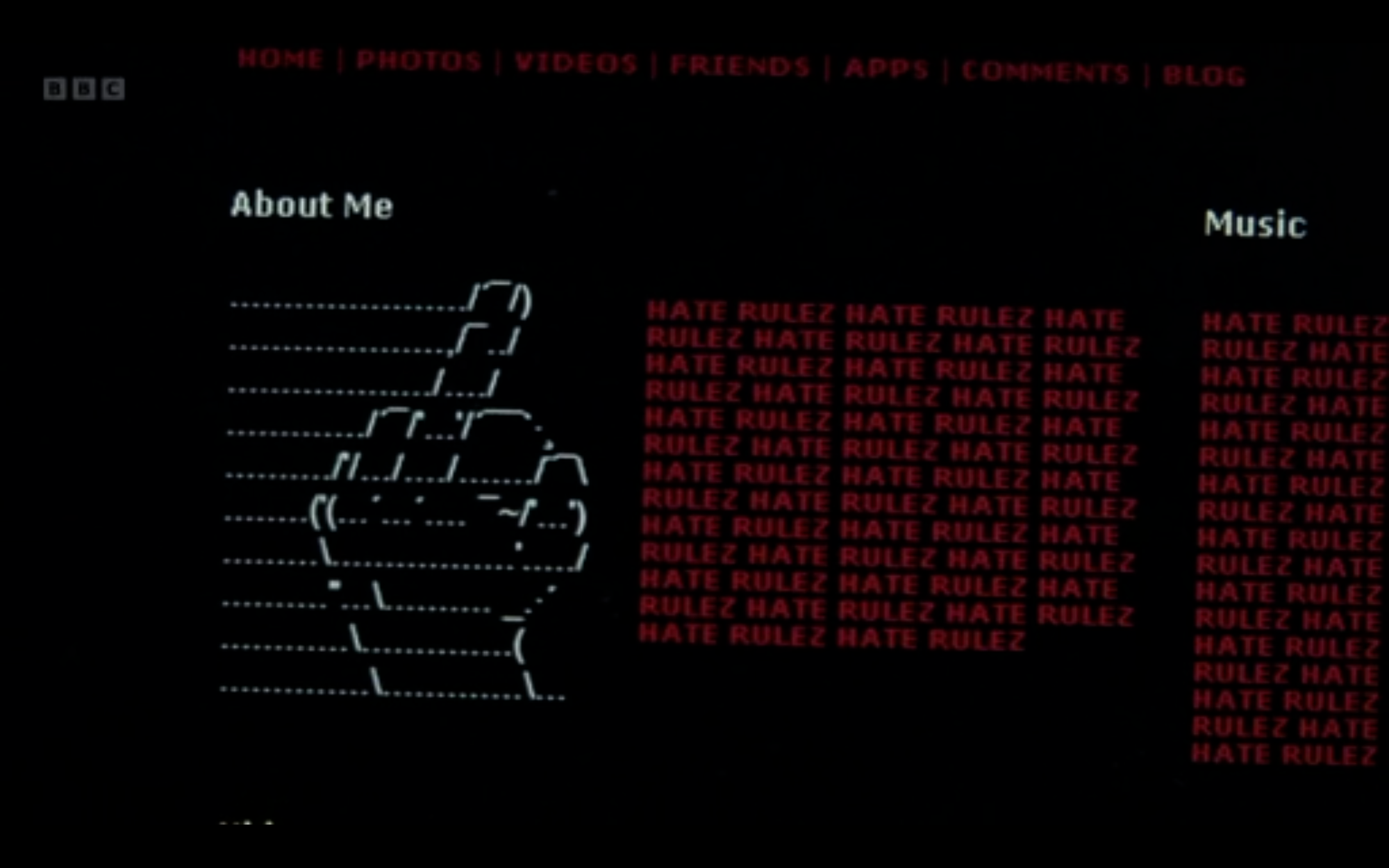 In late 2006, Limmy launched the World of Glasgow podcast, receiving interest from the mainstream press and media. Though the podcast was eventually removed (some of the characters had not aged well), in June 2009, the BBC commissioned series one of Limmy’s Show, first airing in 2010. Several podcast characters evolved into key protagonists of the show: John Paul, a young ned hell-bent on terror and humiliation, is a distillation of the sort of neds Glasgow Survival had satirised, stereotyped and goaded five years before. In series one, episode four, we see Limmy sitting at his desk, shaking his head in disapproval. He points at his computer screen, and the camera shifts to show him looking at John Paul’s website. It’s an HTML affair, text-heavy, with a happy hardcore soundtrack and videos of JP gloating about heinous acts he’s inflicted on others. At the end of the episode the credits roll, notifying the viewer that the episode was written, animated and directed by Brian Limond.