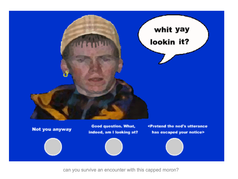 Perhaps the most memorable part of the site was its ‘Toys’ section, which had several Flash games, such as a ‘nedagotchi’ (described as “your very own virtual pet who only really wants fags, bucky and rave music”) and the ‘nedabet’ alphabet keyboard (where ‘a’ was for arsehole, ‘b’ was for bawbag and ‘c’ was for, well…). The Flash-animated videos included ‘Rockin Goth’; a “silent movie set in 20s Glasgow” starring a character called ‘Captain Ned-Hammer’; and the shocking ‘Ned Hanging’, which depicts a ned being hanged by vigilantes. The latter features one of many disclaimers on the website: “Remember, this is just a joke cartoon (albeit in bad taste), and Glasgow Survival does NOT condone the actions performed in it.”